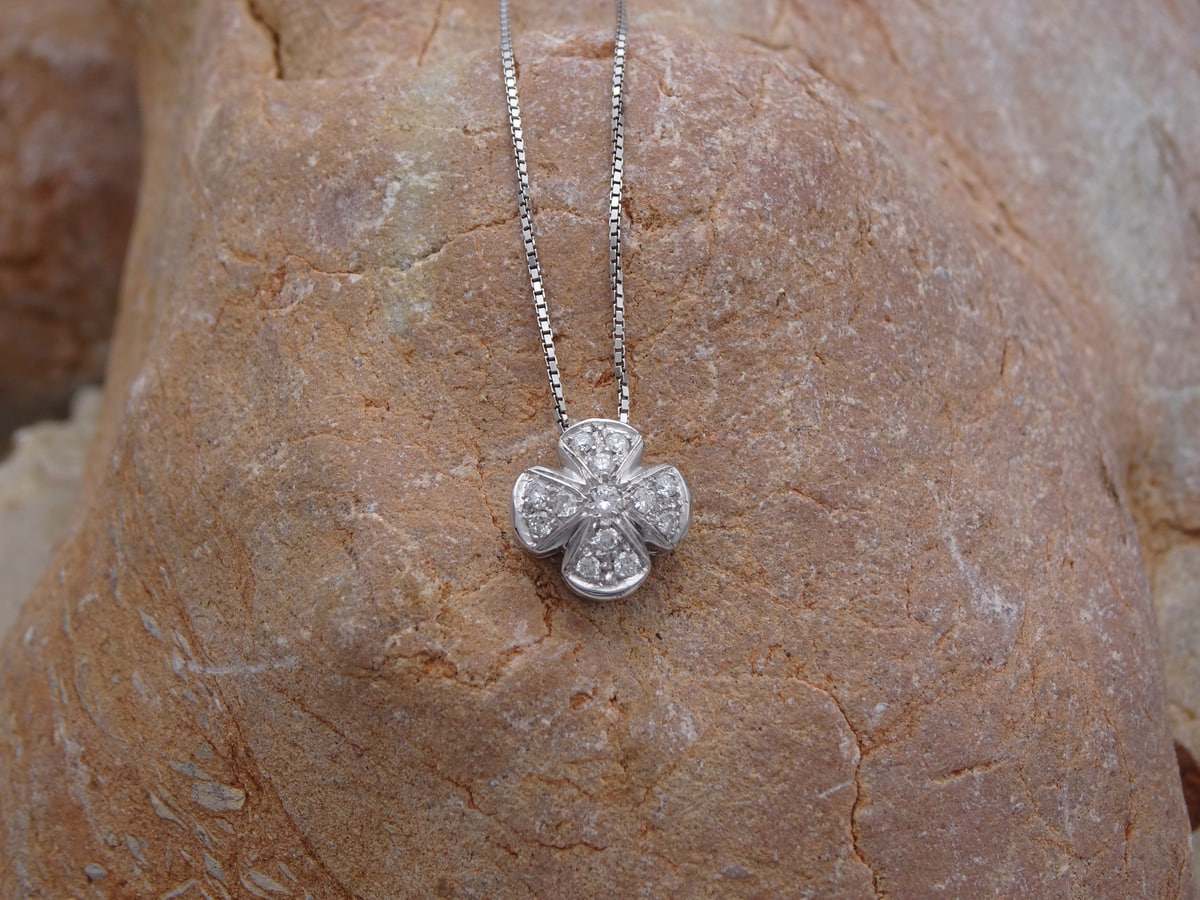 Pendente in oro bianco 18kt a forma di quadrifoglio con incastonatura a pavè completo di catenina.